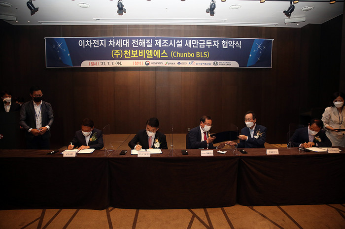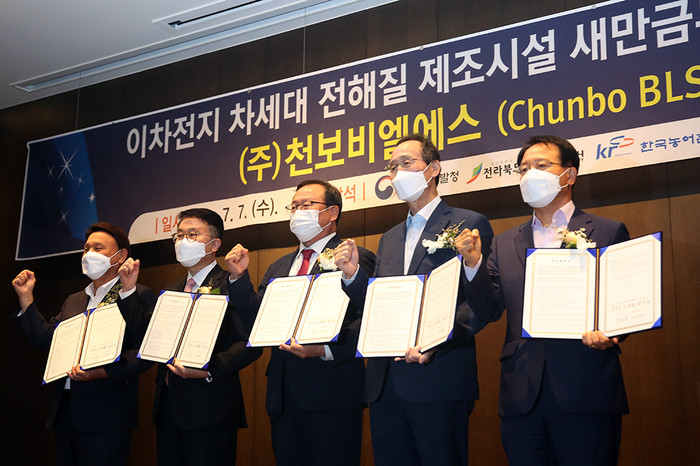 [로컬세계 양해수 기자]새만금개발청은 7일 전라북도, 군산시와 함께 새만금 국가산단에 전기차 핵심부품인 이차전지 전해질 제조공장을 건립하기 위해 ㈜천보 비엘에스와 투자협약을 체결했다.