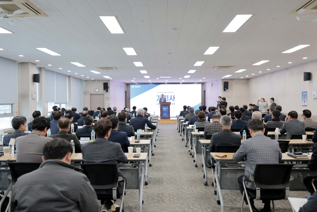 27일 노동진 수협중앙회장(사진 가운데)이 부산시수협 자갈치위판장에서 열린 '해상풍력 특별법 정책설명회'에서 개회사를 하고 있다. 노 회장은 이날 전국 수협 조합장들과 해상풍력 개발 전 과정에 어업인의 참여를 보장하는 구체적인 기준을 제도적으로 마련해 줄 것을 정부에 촉구했다.