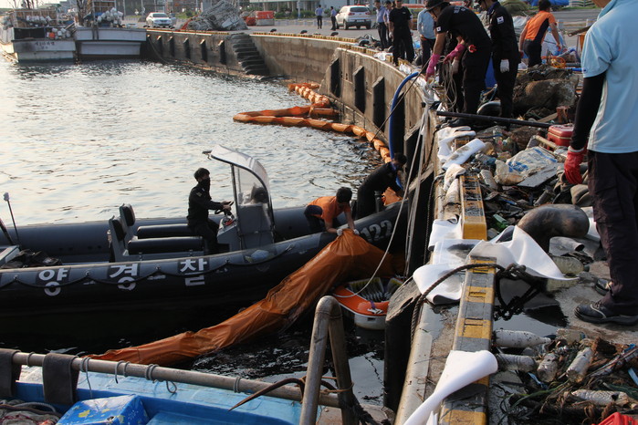 ▲지난해 군산해양경비안전서 직원들이 비응항에서 발생한 해양오염사고의 오염물질을 수거하고 있다. |