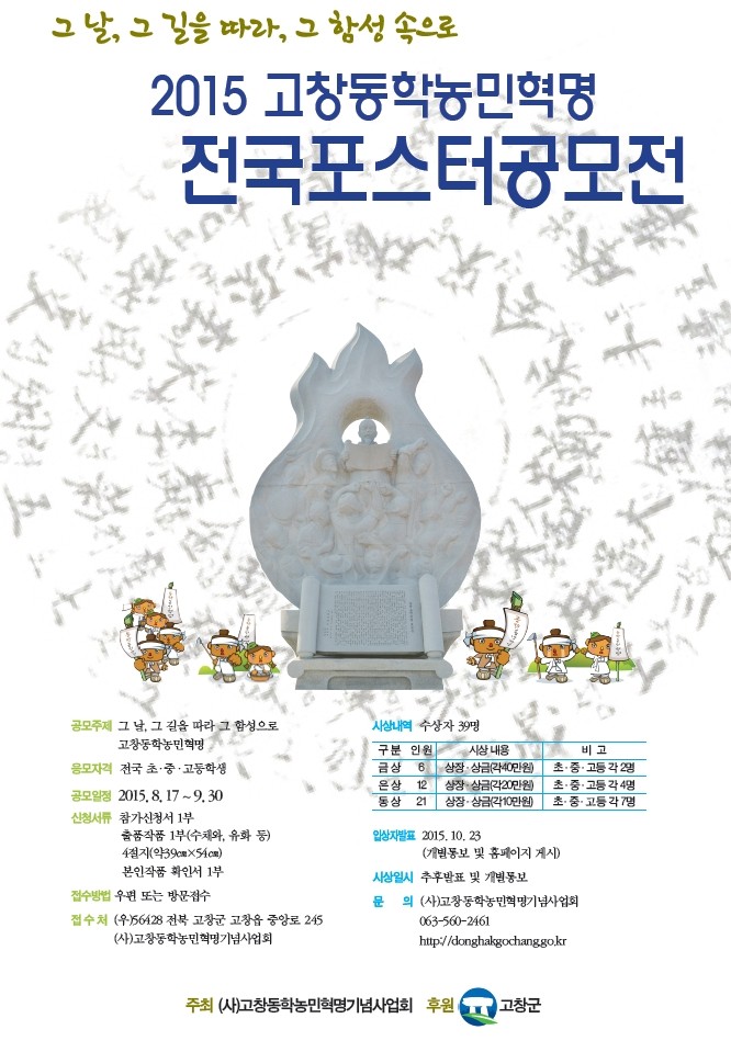 공모전은 전국 초·중·고교생 누구나 참여 가능하며 ‘그 길을 따라 그 날, 그 함성 속으로 고창동학농민혁명’이란 주제로 고창 무장 동학농민혁명 기포의 의미와 동학농민혁명 전국적 전개과정에서 고창지역 활동을 담은 내용이면 된다.