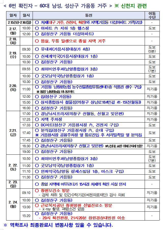 ◆창원 6번 확진자 동선은 아래 표와 같다.