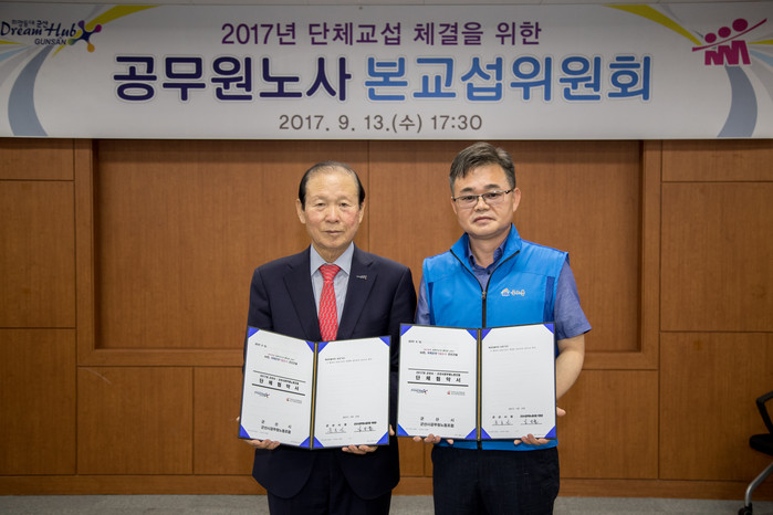 지난 2015년 이후 2년 만에 이뤄진 이날 체결식에는 노사 양측 교섭대표인 문동신 시장과 김상윤 군공노 위원장을 비롯한 교섭위원 20명이 참석했다.
