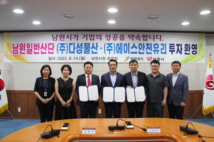 남원시는 14일 ㈜다성물산(대표 김준철), ㈜에이스안전유리(대표 최호림)와 남원 일반산업단지에 대한 투자협약을 체결하고 투자유치를 확정했다.