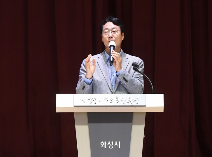 ▲ 정명근 화성시장이 지난 15일 열린 요양보호사의 권익 및 복지향상을 위한 화성시요양보호사협회 창립 선포식에서 인사말을 하고 있다. 화성시 제공 |