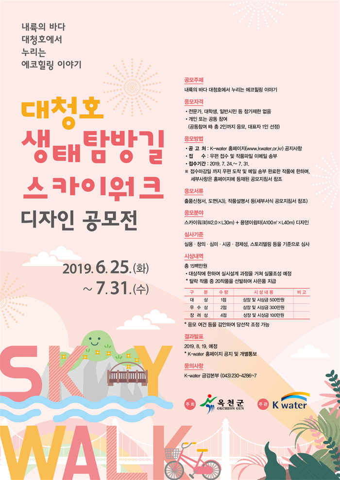 이번 공모는‘내륙의 바다 대청호에서 누리는 에코힐링’을 주제로 옥천군 녹색탐방로 내 스카이워크와 쉼터공간을 국민들의 아이디어를 반영해 스토리텔링을 가미한 특화공간으로 조성하고자 계획됐다.