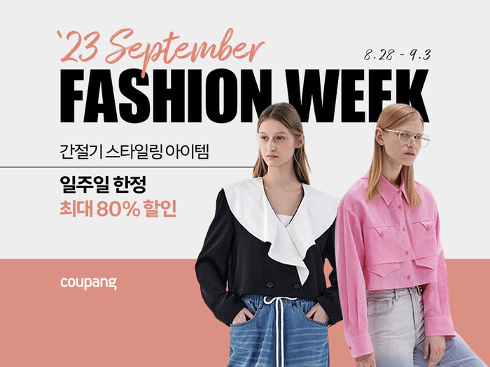 쿠팡이 ‘9월 패션위크’를 통해 간절기 패션 아이템을 제안한다. 행사는 28일부터 오는 9월 3일까지 진행하며 할인율은 최대 80%에 달한다.