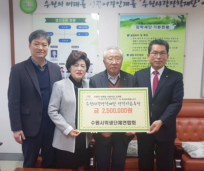 [로컬세계 고용주 기자]경기 수원시 위생단체 연합회가 '인재 양성에 써 달라'며 (재)수원사랑장학재단에 성금 250만원을 전달했다. 전달식은 8일 팔달구 수원사랑장학재단 사무국에서 열렸다.