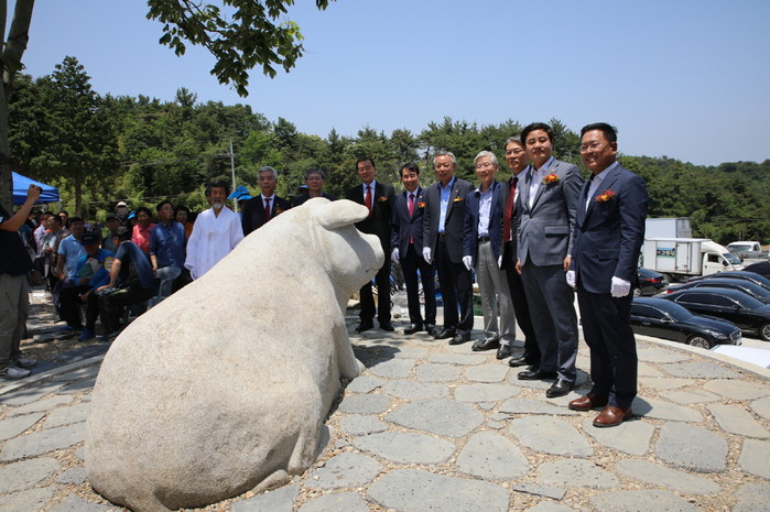 대한한돈협회(회장 하태식)는 4일 경남 하동군 진교면에서 한돈혁신센터 준공식을 개최했다. 이날 열린 한돈혁신센터 준공식에서 대한한돈협회 하태식 회장 및 내빈들이 돼지석상 제막식을 하고 있다. 왼쪽부터 강기갑 전 국회의원, 김홍길 축산관련단체협의회장, 이주명 농축산부 축산정책국장, 홍문표 자유한국당 의원, 하태식 대한한돈협회장, 윤상기 하동군수, 여상규 자유한국당 의원, 김석기 경남도청 서부본부장, 이정훈 경남도의회 의원, 이상용 양돈조합장협의회장.