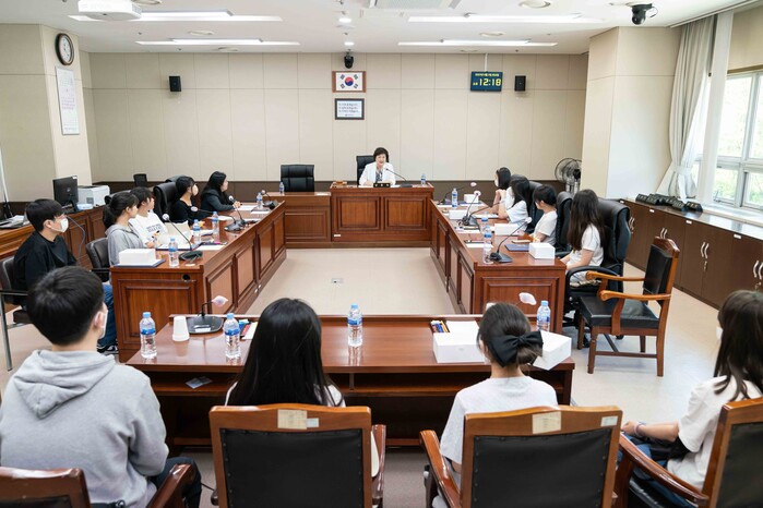 윤원균 의장은 “오늘 학생들의 모의의회 체험으로 의사결정과정을 학습하는 좋은 기회가 되었길 바라며, 시의원과의 만남을 통해 의정활동을 간접 체험하고 소통의 장이 마련되어 앞으로 우리나라를 이끌어 나가는 어른으로 성장하길 기대한다”고 말했다.