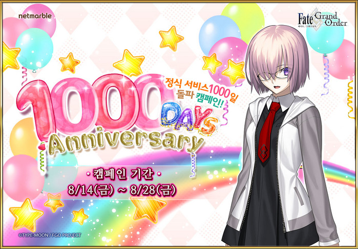 넷마블은 '페이트/그랜드 오더'의 정식 서비스 1000일째가 되는 8월 16일에 접속한 모든 이에게 성정석(게임재화) 10개를 증정한다.
