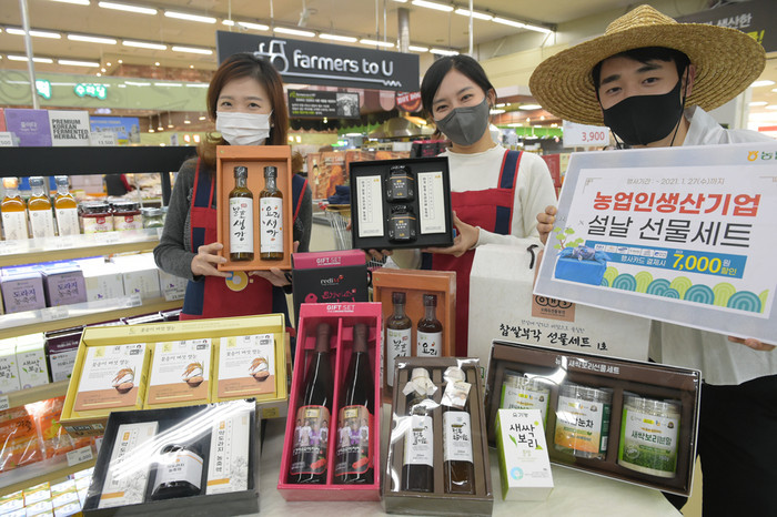 | ▲14일 서울 서초구 농협 하나로마트 양재점에서 모델들이 농업인의 정성으로 만든 농업인 생산기업 선물세트를 선보이고 있다. 우수 농기업 선물세트를 6대 행사카드(NH·국민·하나·삼성·씨티·JB전북은행카드)로 결제 시 최대 7000원 할인된 가격에 구매할 수 있다.(농협유통 제공) |
