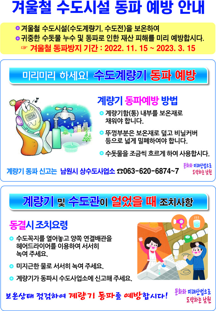 시 관계자는 “계량기 동파 예방은 가정과 사업체에서 1차적으로 조치한다면 충분히 막을 수 있지만 강력한 추위에 계량기가 동파되면 신속하게 상수도사업소로 신고해 도움을 받으시기 바란다”고 밝혔다.