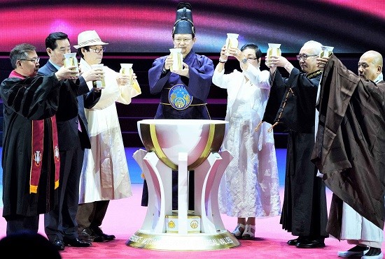 ▲ 국내 각 종단 대표들이 세계평화와 종교계의 화합을 기원하는 합수의식을 하고 있다. |
