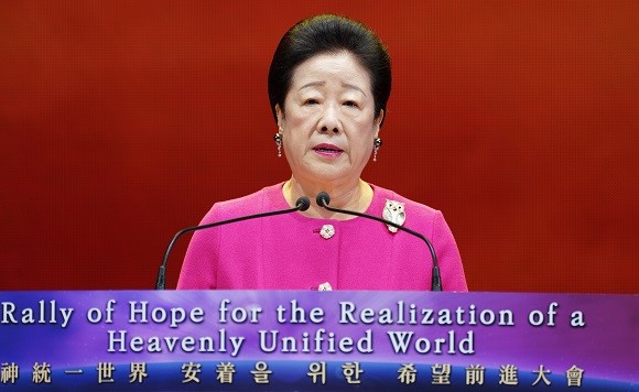 ▲9일 경기도 가평 청심평화월드센터에서 '신(神)통일세계 안착 위한 전세계 100만 온라인 희망전진대회'가 열리는 가운데 한학자 총재가 특별연설을 하고 있다. 세계평화통일가정연합 제공 |
