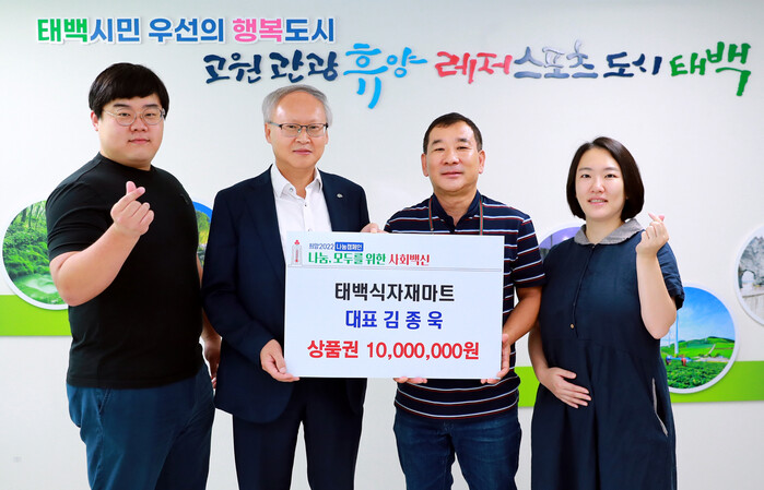 [로컬세계=박상진 기자] 태백식자재마트 김종욱 대표와 가족은 16일 태백시청을 방문해 지역의 저소득층 가정에 전해달라며 식자재상품권 1만원권 1000장을 전달했다.