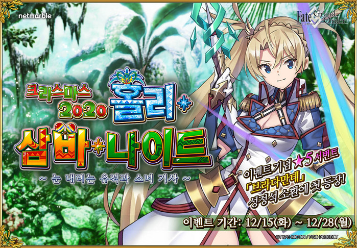 넷마블(대표 권영식, 이승원)은 모바일 RPG(역할수행게임) '페이트/그랜드 오더(Fate/Grand Order)'에서 신규 이벤트 '크리스마스 2020 홀리 삼바 나이트'를 오는 28일까지 개최한다고 밝혔다.