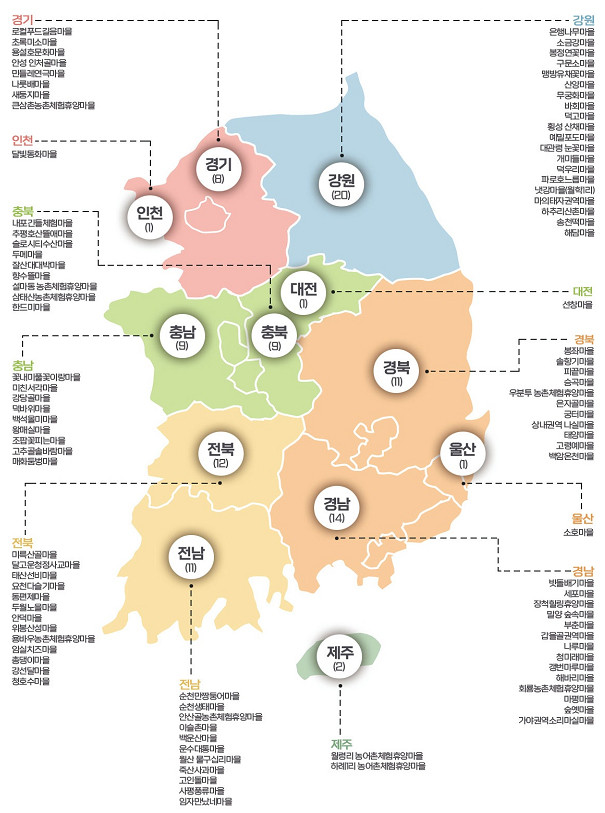 선정된 마을을 시도별로 보면 강원 20곳, 경남 14곳, 전북 13곳, 전남·경북 각 11곳, 충남·충북 각 9곳, 경기 8곳, 제주 2곳, 인천·대전·울산 각 1곳(광역시 단위)이다.