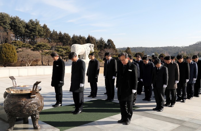 | ▲김영문 관세청장이 3일 2018년 새해를 맞아 관세청 간부 40여명과 함께 국립대전현충원을 참배 분향하고 있다. |