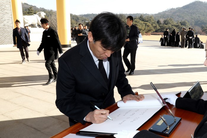 | ▲김영문 관세청장이 3일 국립대전현충원을 참배하며 방명록을 쓰고 있다. |