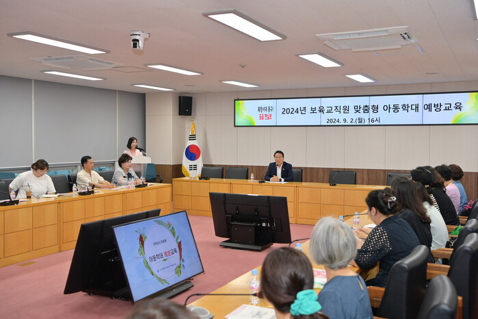 ▲ 김진홍 구청장이 '2024년 보육교직원 맞춤형 아동학대 예방교육'을 주재하고 있다. 동구청 제공 |