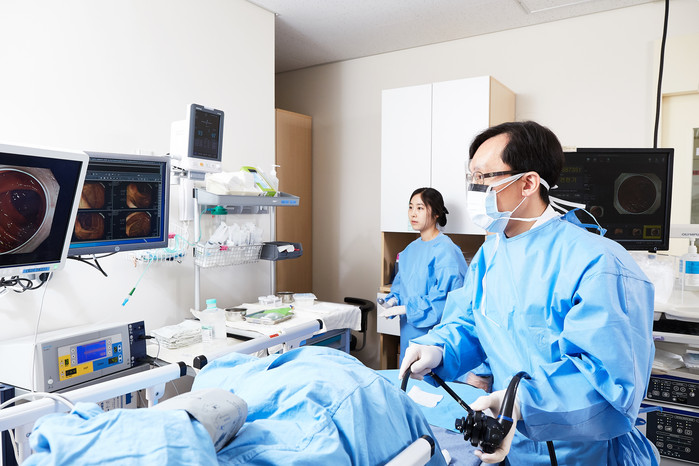 ▲강동경희대병원 소화기내과 차재명 교수와 의료진이 한 환자의 대장내시경 검사를 하고 있다. |