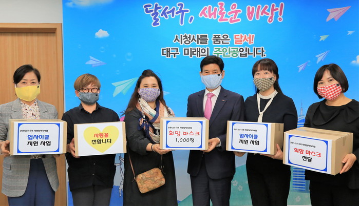 [로컬세계 박세환 기자]대구 달서구는 지난 8일 구청장실에서 코로나19 극복 희망일자리사업 참여자들이 손바느질과 재봉틀을 활용해 만든 면마스크 1000장을 다문화가정에 전달하는 행사를 가졌다고 12일 밝혔다.