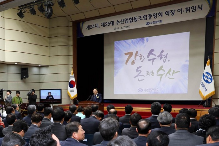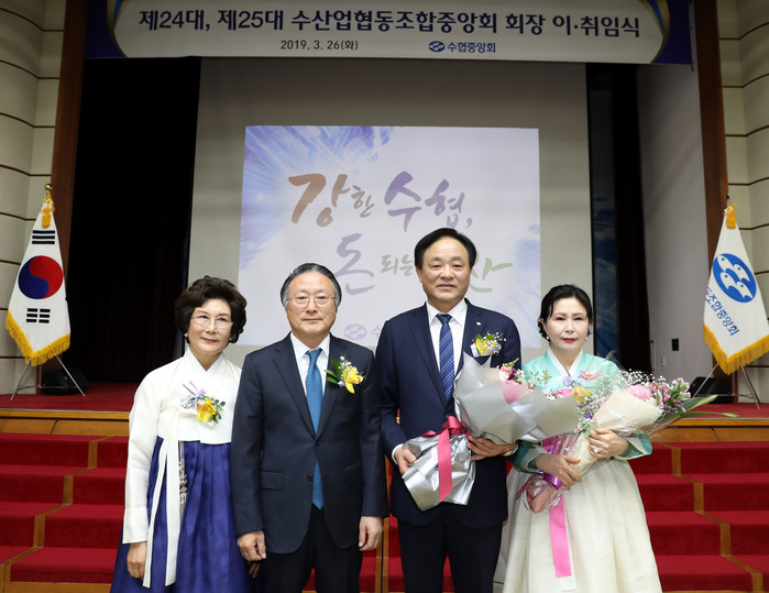26일 수협중앙회에서 열린 회장 이취임식에서는 퇴임하는 24대 김임권 회장과 신임 임준택 회장이 나란히 단상에 올라 회장직 인수인계가 이루어졌다.