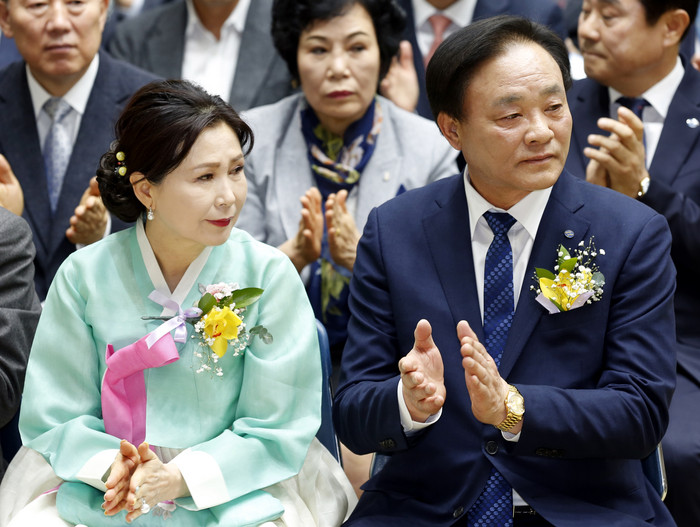 | ▲26일 서울 송파구 수협 본부청사에서 진행된 제24대, 제25대 수협중앙회장 이취임식에서 새롭게 취임한 25대 임준택 수협회장 부부가 박수를 치고 있다. |