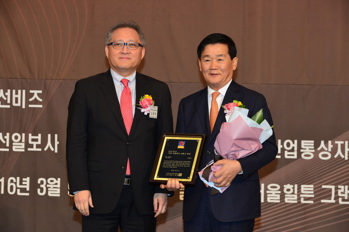 ▲박우정 고창군수(오른쪽)이 9일 서울 밀레니엄힐튼호텔에서 열린 ‘제6회 한국의 가장 사랑받는 브랜드 대상’에서 ‘귀농귀촌부문’ 대상을 수상하고 있다. |
