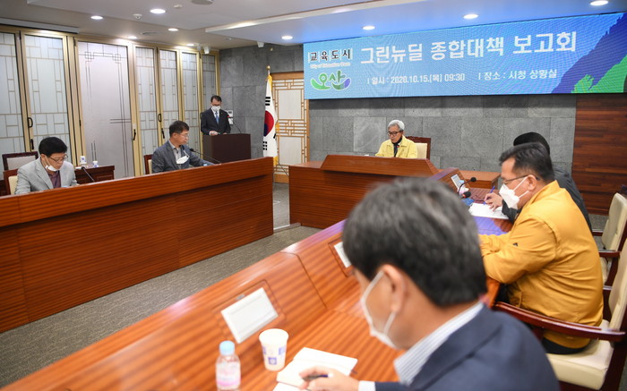 [로컬세계 고용주 기자]경기 오산시는 15일 시청 상황실에서 곽상욱 시장과 국·과장 등이 참석한 가운데 2020년 그린뉴딜 종합계획 수립을 위한 보고대회를 가졌다고 밝혔다.