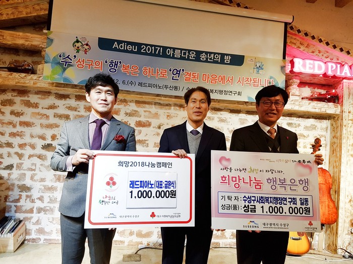 이날 '성금전달식'에서 수성구 사회복지공무원들이 소외된 계층을 돕기 위해 십시일반 모은 성금 100만원을 이진훈 구청장에게 전달했고, 또 레드피아노 금윤식 대표도 그 뜻을 따라 식비의 일부인 100만원을 이웃돕기 성금으로 내놓았다.
