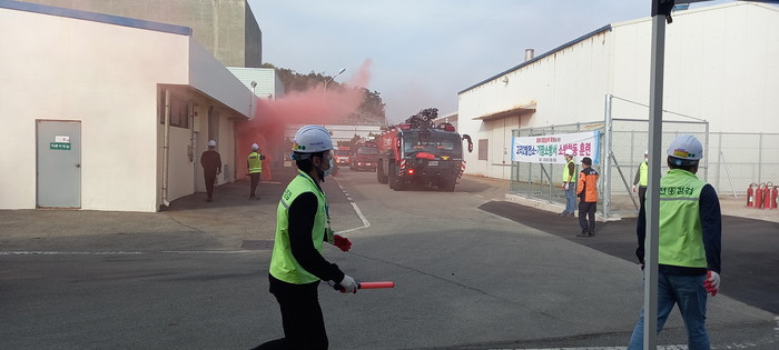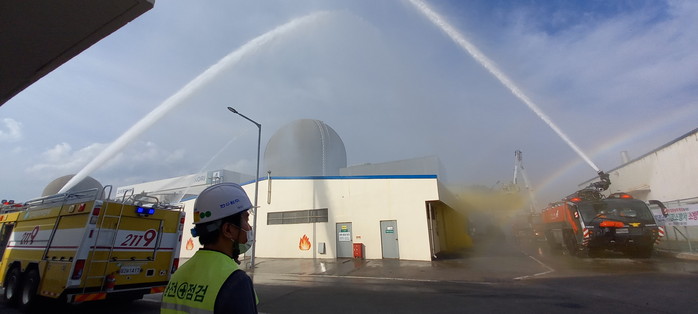 훈련의 주요내용은 ▲제2발전소 내 위험물 화재를 가상한 집중 종합방수 ▲소화전과 취수장 등 소방용수 확보방안 확인 ▲무인파괴방수탑차와 원전 내 소방시설 소화전 연결 커플링 적정여부 및 호환성 확인 ▲비상시 냉각기능을 수행할 수 있는 비상냉각수 외부주입유로 소방차량 연결 확인 등을 실시했다.