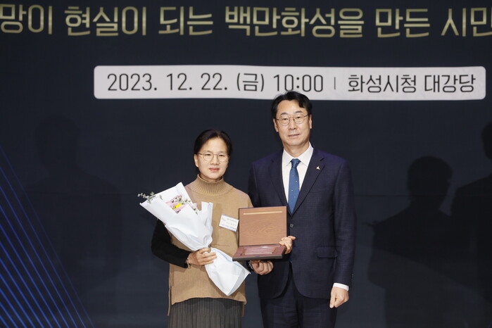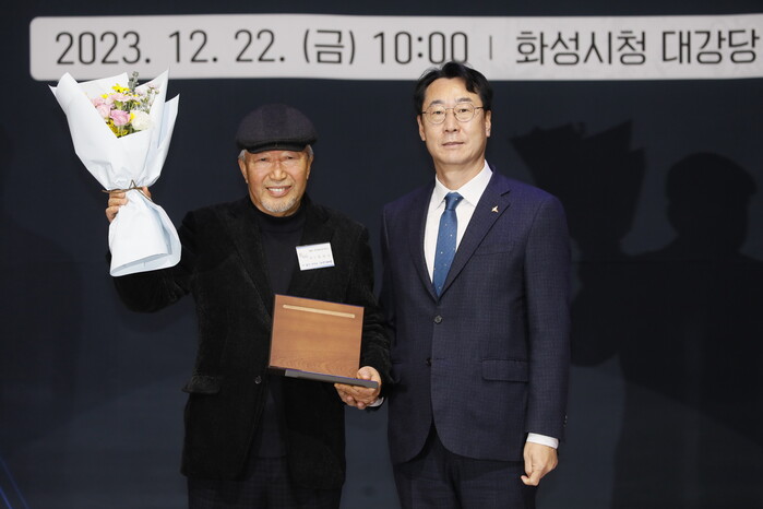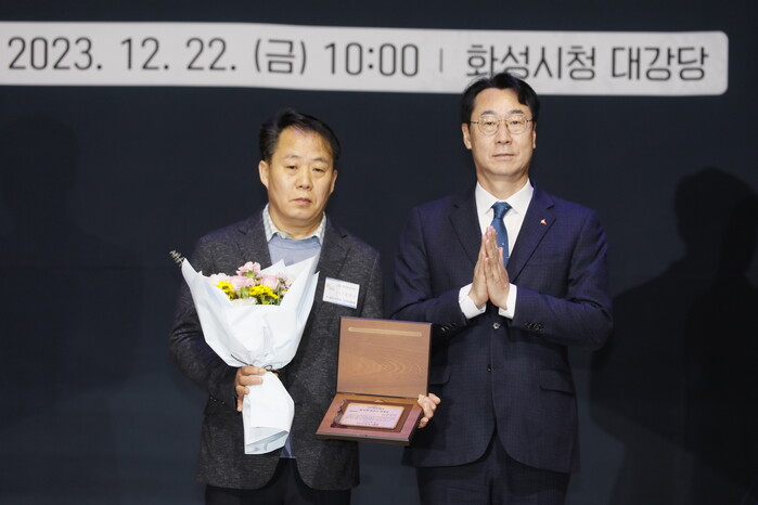 | ▲ 정찬모(왼쪽) 수상자. 화성시 제공 |