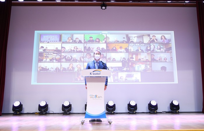 | ▲물과 환경의 소중함을 알리는 활동을 이어온 ‘제14기 한국수자원공사 대학생 서포터즈’ 온라인 수료식을 진행하고 있는 박재현 한국수자원공사 사장. 뒤편 화면으로는 온라인으로 수료식에 참석한 서포터즈 대원들이 보이고 있다. 한국수자원공사 제공 |