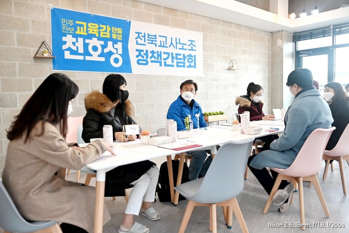 천호성 전북교육감 예비후보는 22일 오후 2시 정재석 전북교사노조 위원장을 비롯한 전북교사노조 대표자 10여 명을 만나 정책간담회를 갖고 전북교사노조에서 제안한 정책에 대한 입장을 밝혔다.