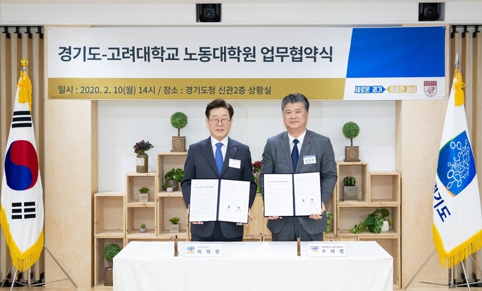 이재명 경기도지사는 10일 오후 경기도청 상황실에서 조대엽 고려대학교 노동대학원장과 이 같은 내용을 담은 ‘경기도-고려대 노동대학원 업무협약’을 체결했다.