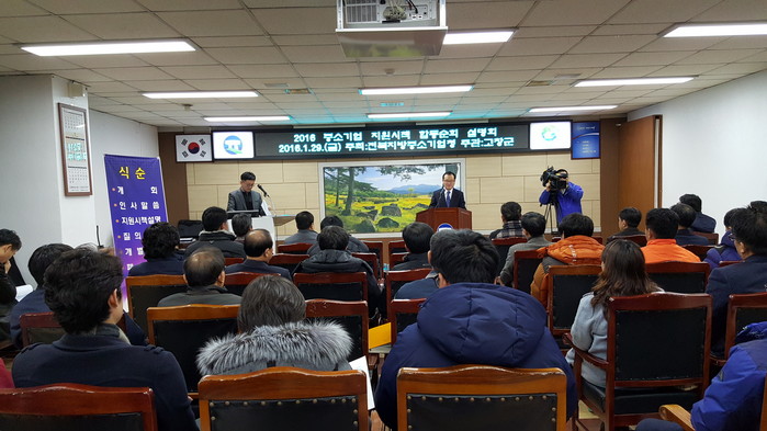▲고창군 김상호 부군수가 29일 군청 상황실에서 지역 중소기업 대표 및 관계자들에게 중소기업 지원시책을 설명하고 있다. |