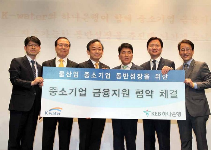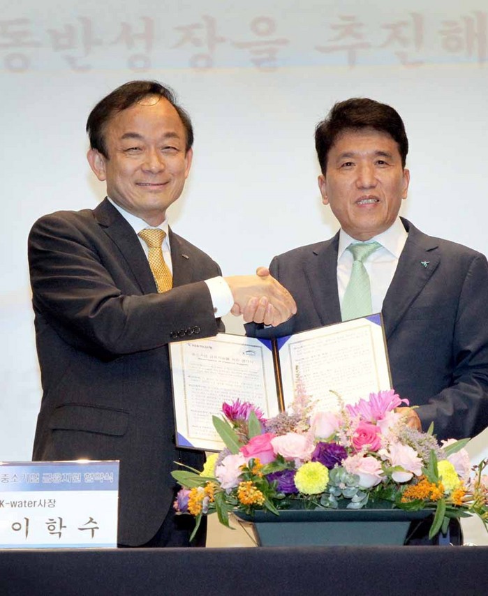 | ▲ K-water가 19일 서울시 서초구 aT센터에서 정부, 학계, 기업 관계자와 함께 ‘일자리 창출과 중소기업과의 동반성장을 위한 물산업 오픈플랫폼 구축 워크숍’을 개최했다. 이학수 K-water 사장(왼쪽)과 함영주 하나은행장(오른쪽)이 중소기업 금융지원 협약식을 마치고 기념촬영을 하고 있다. |