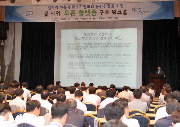 | ▲K-water가 19일 서울시 서초구 aT센터에서 정부, 학계, 기업 관계자와 함께 ‘일자리 창출과 중소기업과의 동반성장을 위한 물산업 오픈플랫폼 구축 워크숍’을 개최했다. 이학수 K-water 사장이 환영사를 하고 있다. |