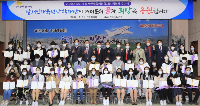 [로컬세계 박세환 기자](재)달서인재육성장학재단은 지난 11일 오후 4시 2층 대강당에서 재단임원, 후원인, 장학생 및 학부모 등 80여 명이 참석한 가운데 ‘달서인재육성장학재단 2020년 하반기 장학금 수여식’을 가졌다고 12일 밝혔다.