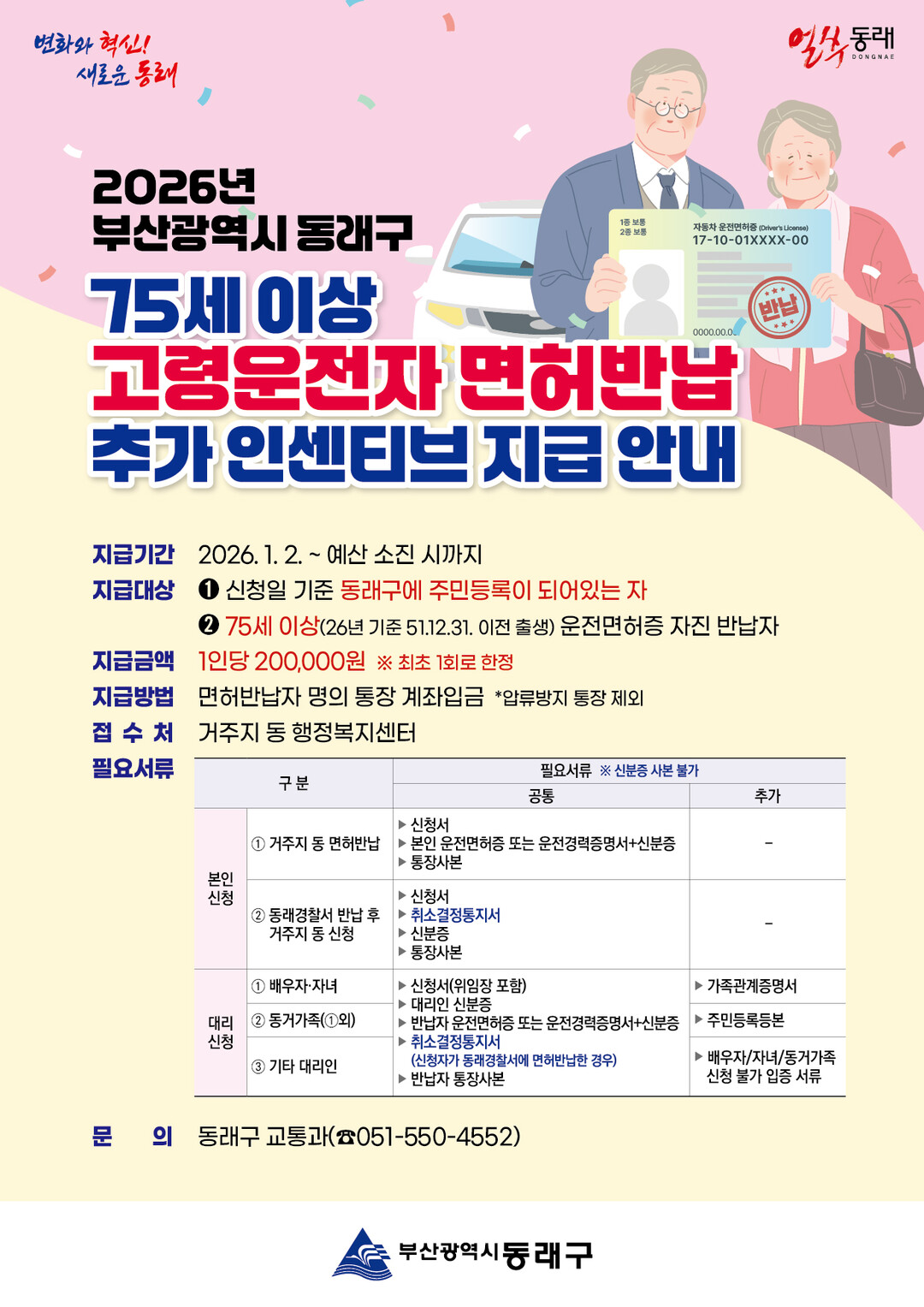 [로컬세계 = 김의준 기자]부산 동래구는 고령 운전자 교통사고를 예방하고 안전한 교통 환경을 조성하기 위해 2026년부터 ‘고령 운전자 운전면허 자진 반납 추가 인센티브 지급 사업’을 추진한다고 밝혔다.