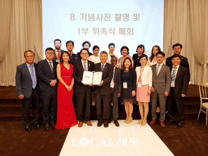 | ▲3일 지태용 세계부동산연맹 아.태 회장(앞줄 중앙)이 조직위원회 발대식 및 위촉식을 갖고 "2017 아시아태평양 부동산회의 부산대회" 성공 개최를 위해 기념촬영을 하고 있다. 김재덕 기자. |