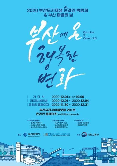 이번 박람회는 부산시와 16개 구·군, 타시도, 마을공동체, 유관기관 등이 참가하며 ▲온라인 전시관 ▲부산 도시재생 16강전(라이브 생방송) ▲온라인 세미나 ▲부산 도시재생 로드 등 다양한 행사가 펼쳐질 예정이다.
