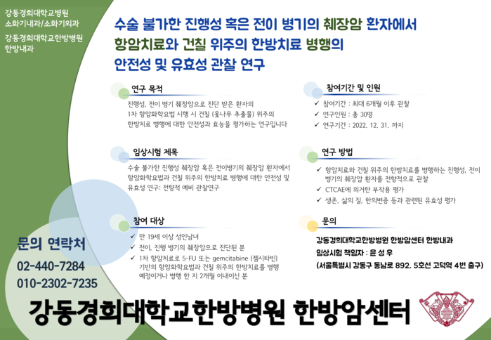 강동경희대학교병원 한방암센터 윤성우 교수팀, 소화기내과 주광로 교수팀은 수술이 불가한 진행성 혹은 전이성 췌장암을 진단받고 1차 항암치료를 시작하는 환자에게 건칠 위주의 한방치료를 병행하는 관찰 연구를 시행한다. 이번 연구는 의·한 협진 연구를 통해 항암치료의 부작용을 완화하고 항암치료의 효과를 증진할 수 있는지 규명하는 것을 목적으로 진행된다.