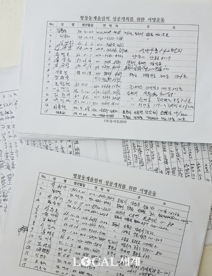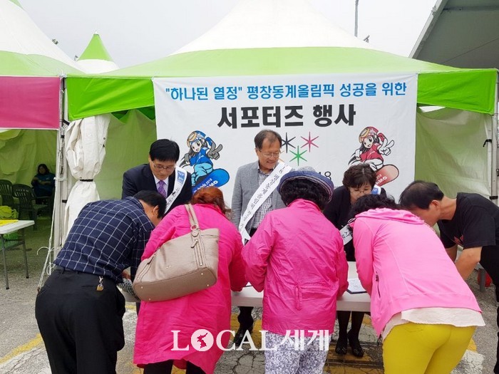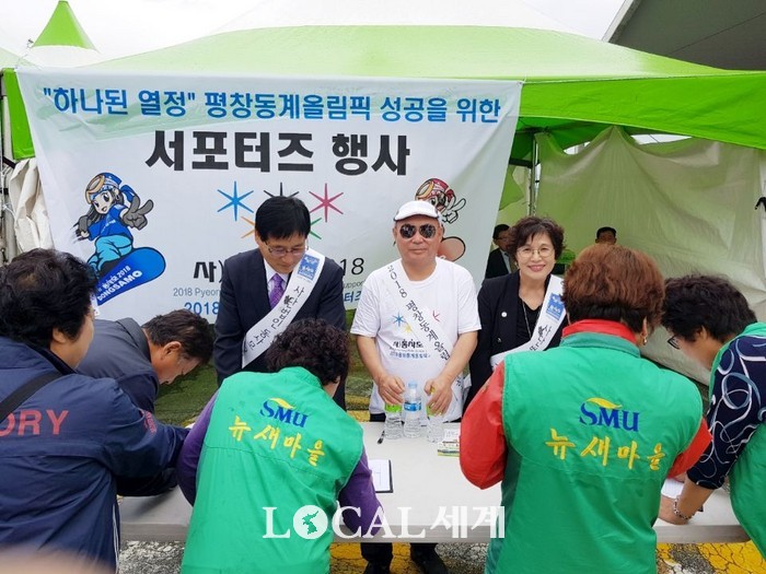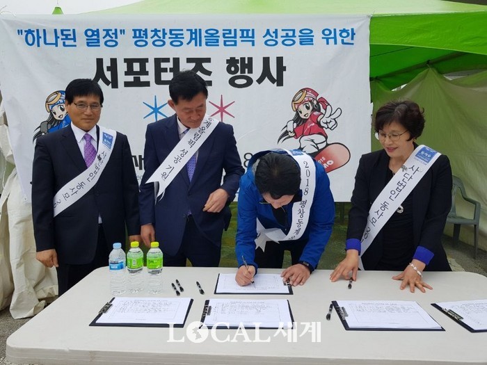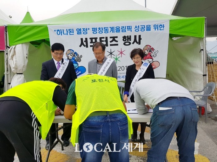 [로컬세계 김민우 기자]사단법인 동사모2018 서포터즈 포천지회 남원자, 박상용 홍보대사 및 홍보위원들이 지난 1일 제5회 포천한우축제 행사장에 마련된 동사모2018 홍보부스에서 '하나된 열정' 평창동계올림픽 성공개최를 위한 홍보활동과 포천시민들의 염원이 담긴 서명을 받았다.