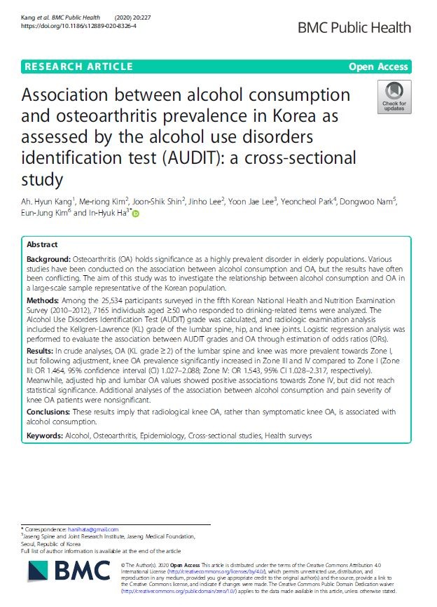 ▲‘BMC Public Health’ 2020년 2월호에 게재된 해당 연구 논문 「Association between alcohol consumption and osteoarthritis prevalence in Korea as assessed by the alcohol use disorders identification test (AUDIT): a cross-sectional study」 |