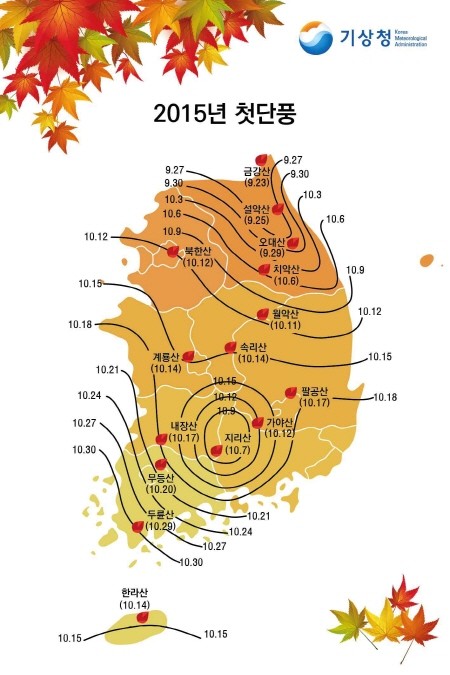 이에 따라 올해 첫 단풍은 평년보다 1~2일 빠를 것으로 예상되는데, 이는 이달 1~15일까지의 일 평균기온이 평년보다 낮았고 16~30일까지의 후반 기온은 평년과 비슷할 것으로 보이기 때문이라고 기상청은 설명했다.