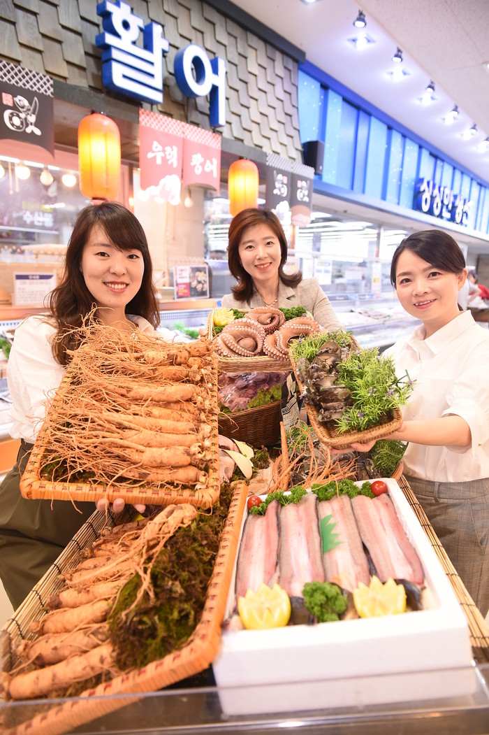 | ▲25일 서울 서초구 하나로마트 양재점에서 고객들의 건강한 여름을 보낼 수 있도록 직원들이 엄선한 보양식 상품을 선보이고 있다.(농협유통 제공) |