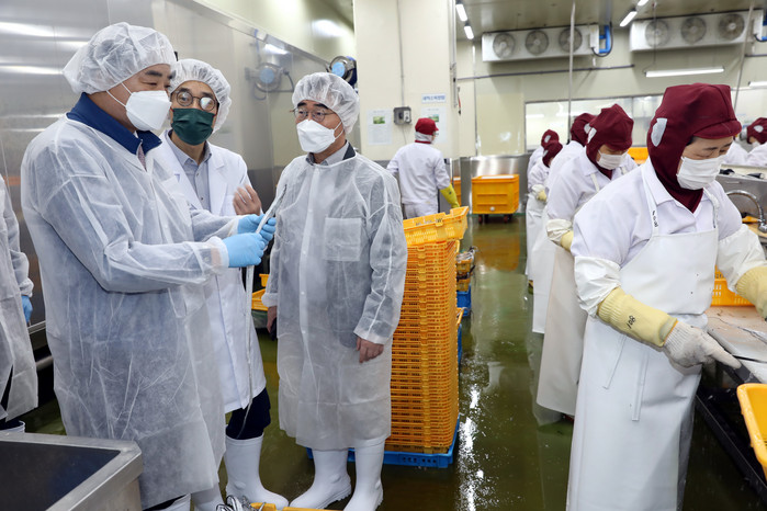 | ▲임준택 수협중앙회장(사진 가장 왼쪽)이 15일 감천항물류센터를 찾아 갈치 가공 현장을 둘러보고 있다. |
