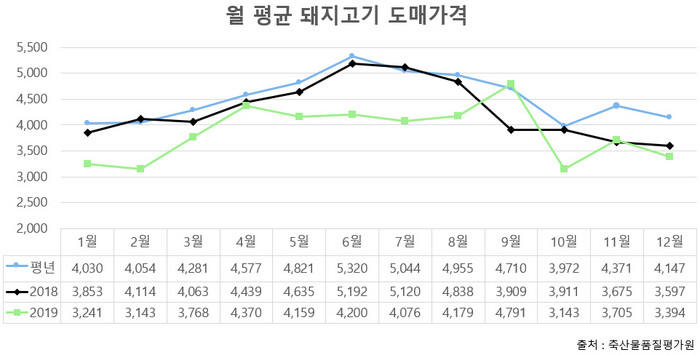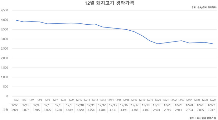 축산물품질평가원이 발표한 자료에 따르면, 12월(27일 기준) 전국(제주제외) 도매시장의 돼지고기평균(탕박.등외제외) 경매가격은 kg당 3394원을 기록했다. 이는 12월 평년 가격인 4147원보다 18% 낮은 수준이며, 가격하락이 시작됐던 작년 12월 3597원보다도 낮은 가격이다.